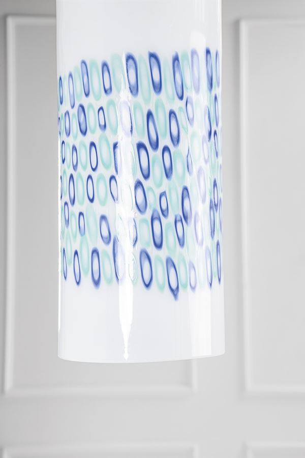 Ottone, vetro lattimo incamiciato con inclusione di murrine in vetro colorato.