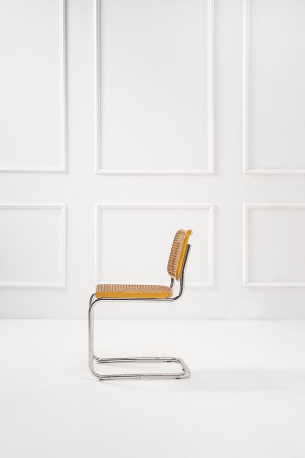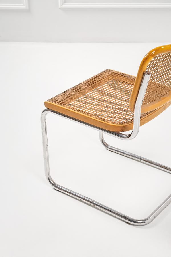 Tubolare d'acciaio curvato e cromato, legno naturale, paglia di Vienna.