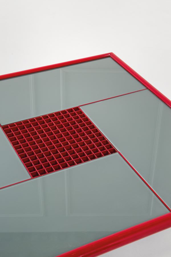 Legno laccato rosso, vetro specchiato.