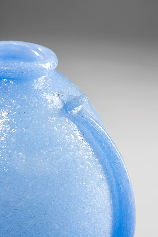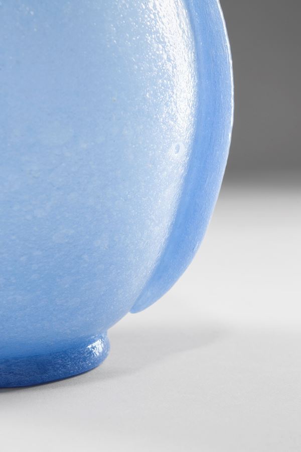 Vetro soffiato pulegoso azzurrino, con due applicazioni lineari ai lati pinzate alle estremità.