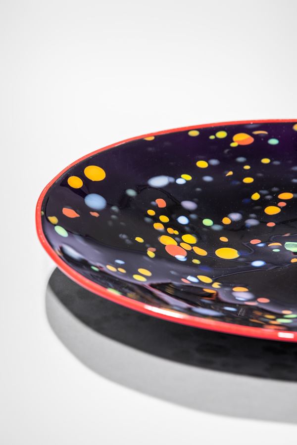 Vetro soffiato nero con macchie policrome e filo rosso applicato al bordo.