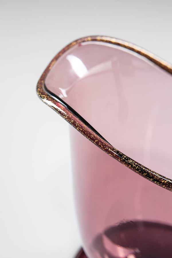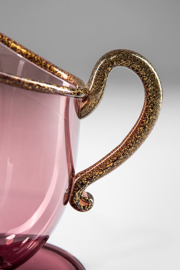 Vetro soffiato trasparente ametista con piede a disco, bordo e manico con applicazione di foglia d’oro.