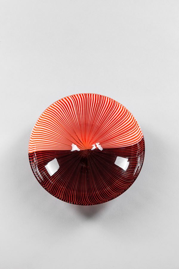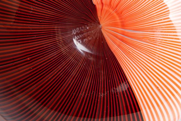 Vetro soffiato bicolore a sottili canne arancio e nero e arancio e cristallo.