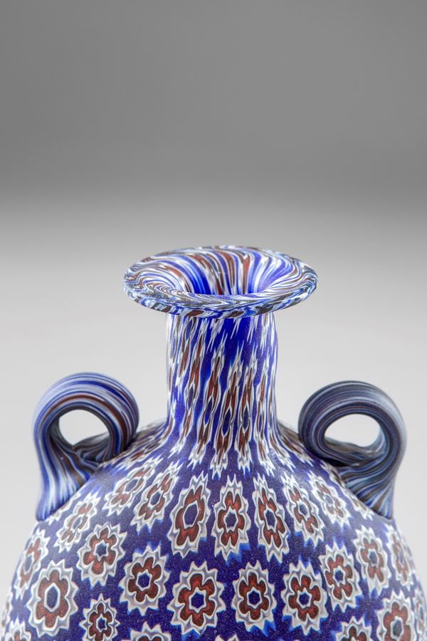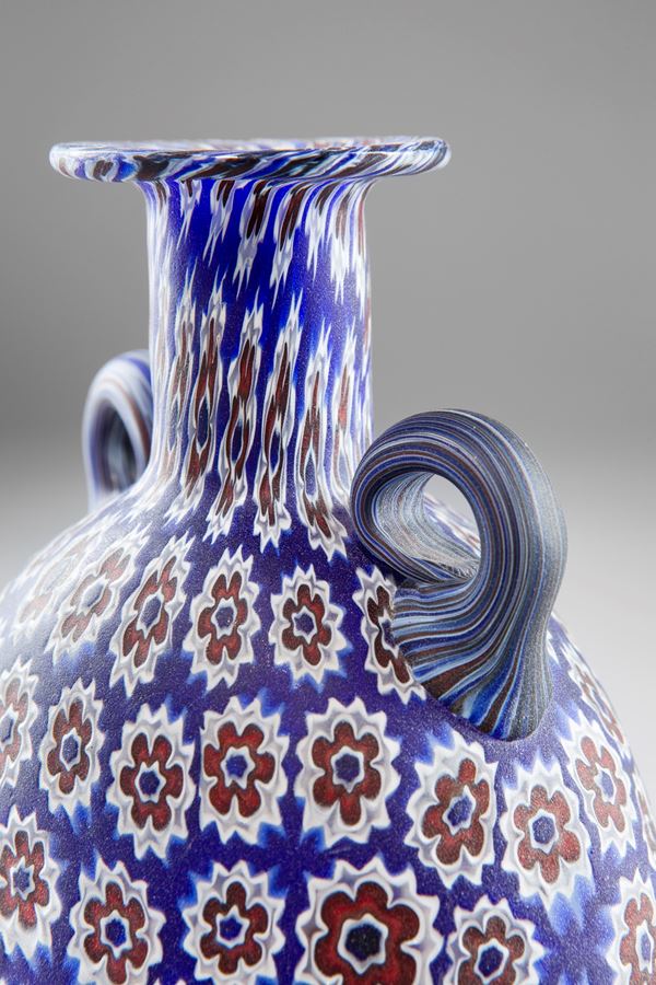 Vetro soffiato a murrine policrome con due piccole anse applicate a caldo.