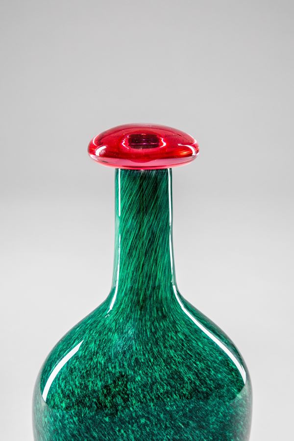Vetro soffiato incamiciato verde con tappo in vetro rubino.