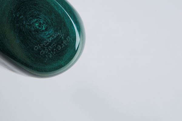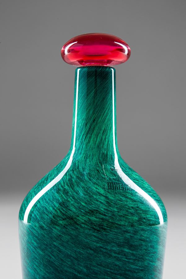 Vetro soffiato incamiciato verde con tappo in vetro rubino.