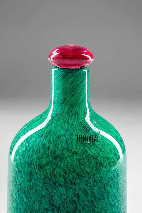 Vetro soffiato incamiciato verde con tappo in vetro rubino.