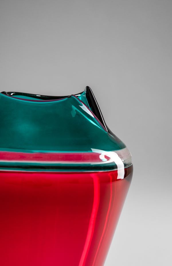 Vetro soffiato ad incalmo rosso rubino e verde.