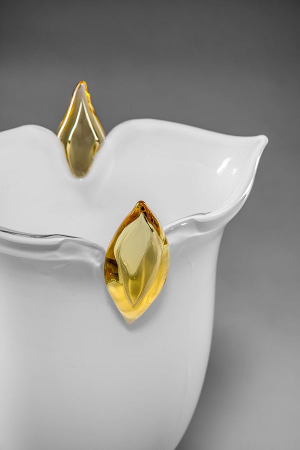 Vetro soffiato lattimo con applicazioni in cristallo colorato.