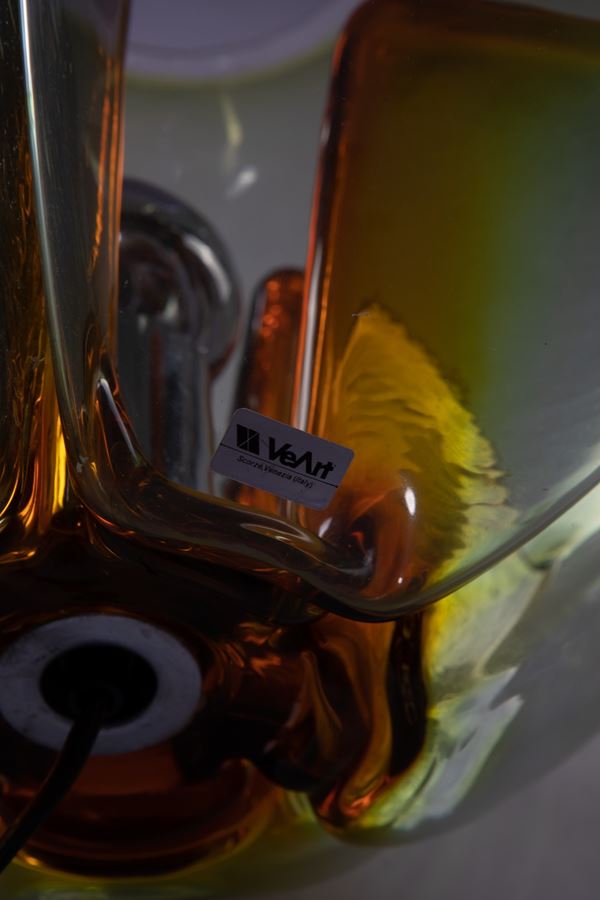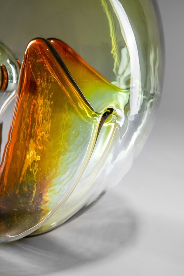 Vetro sfumato verdino/ambra soffiato in stampo.