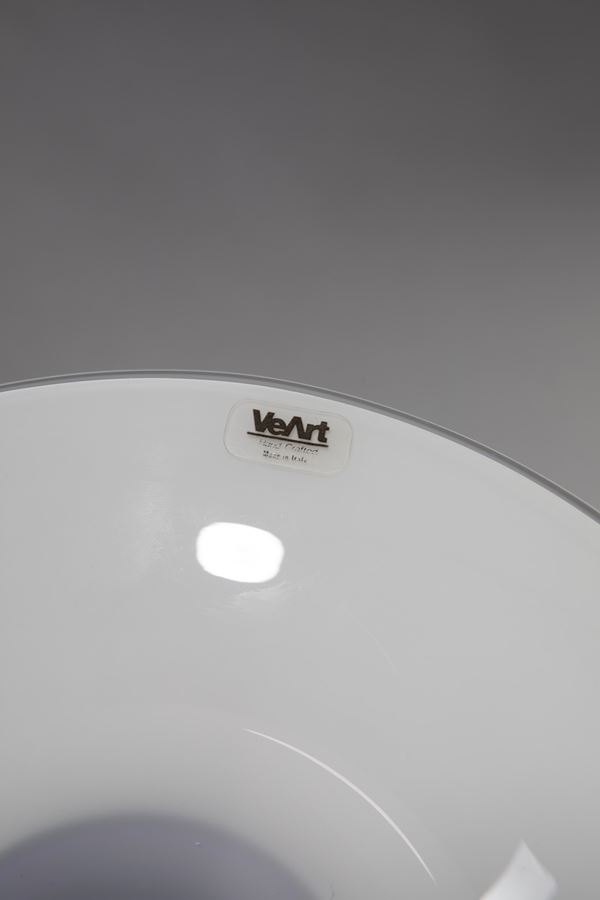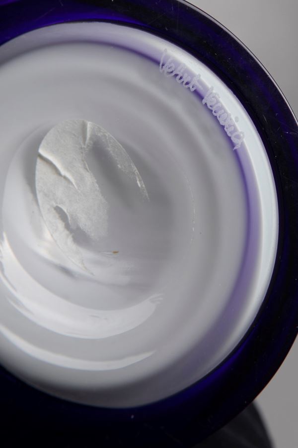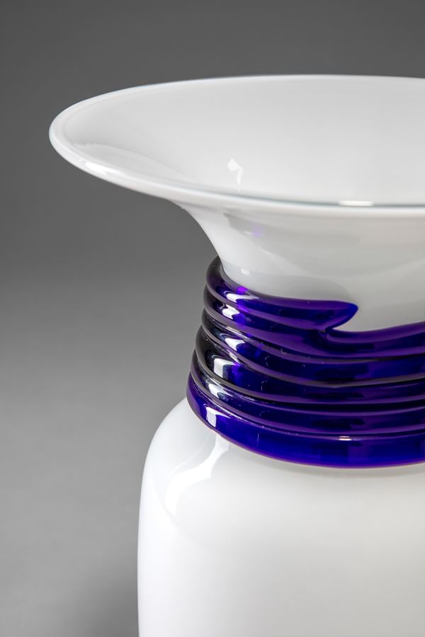 Vetro soffiato lattimo con filo blu applicato al collo e alla base.