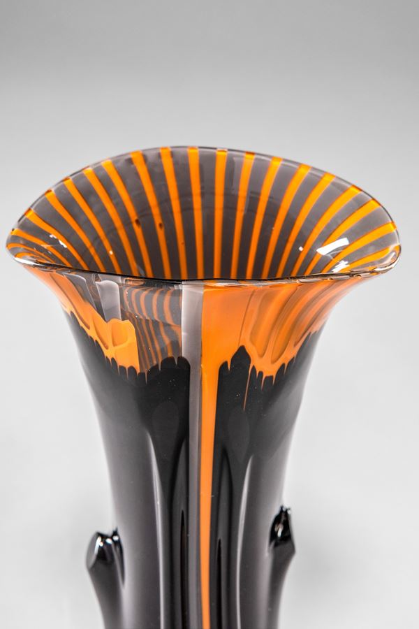 Vetro soffiato nero e canne ambra, incamiciato e molato.