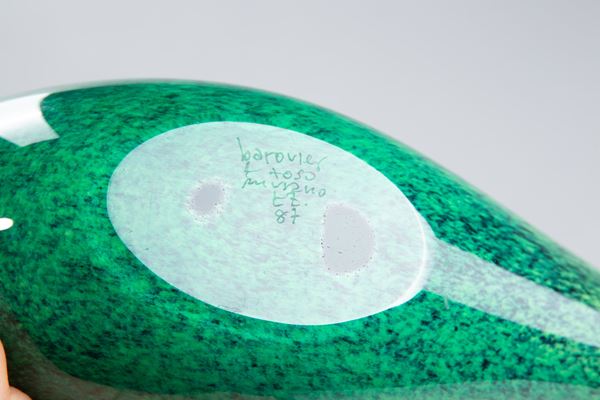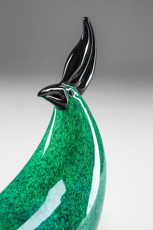 Vetro soffiato verde con particolari in pasta vitrea nera.