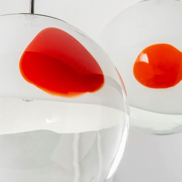 Vetro soffiato trasparente con inclusione di fascia lattimo e macchia colorata, metallo cromato.