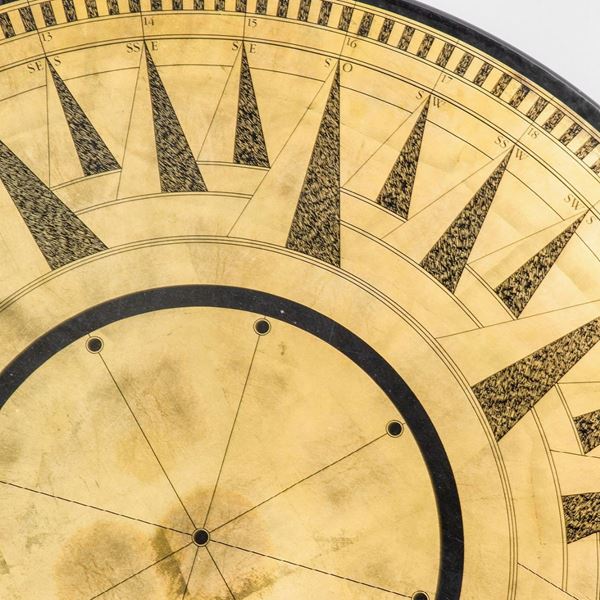 Legno laccato, piano decorato con la rosa dei venti in oro e nero e lacca nera.