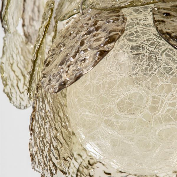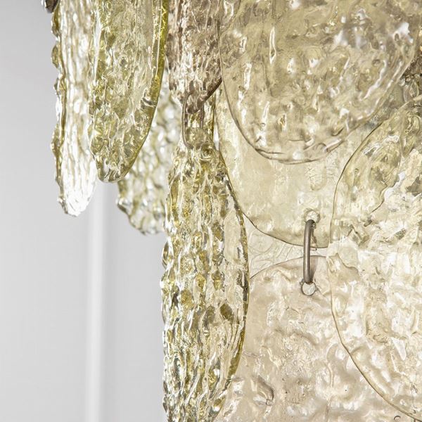 Metallo cromato, elementi modulari in vetro bugnato rifrangente lavorato a mano e colorato.
