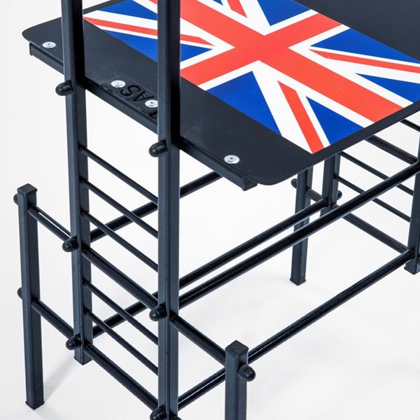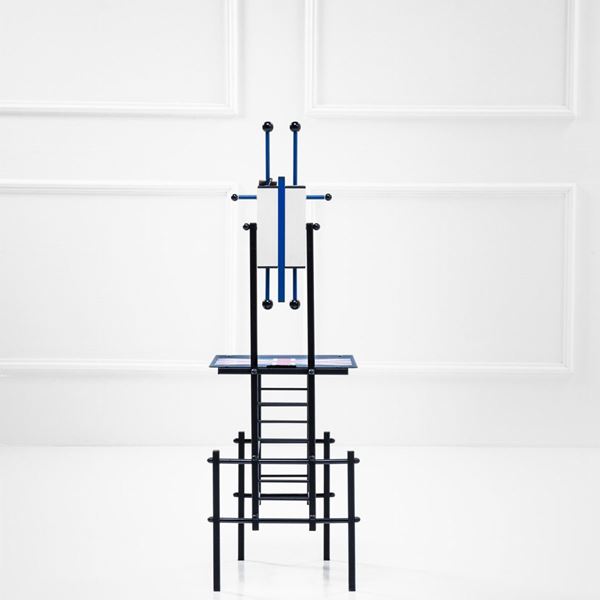 Etichetta metallica con il marchio dell'artista AS, cartellino in legno con numero 28.