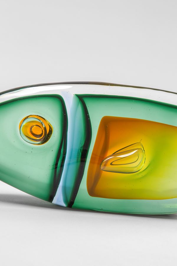 Vetro cristallo soffiato, sommerso verde, azzurro e giallo.