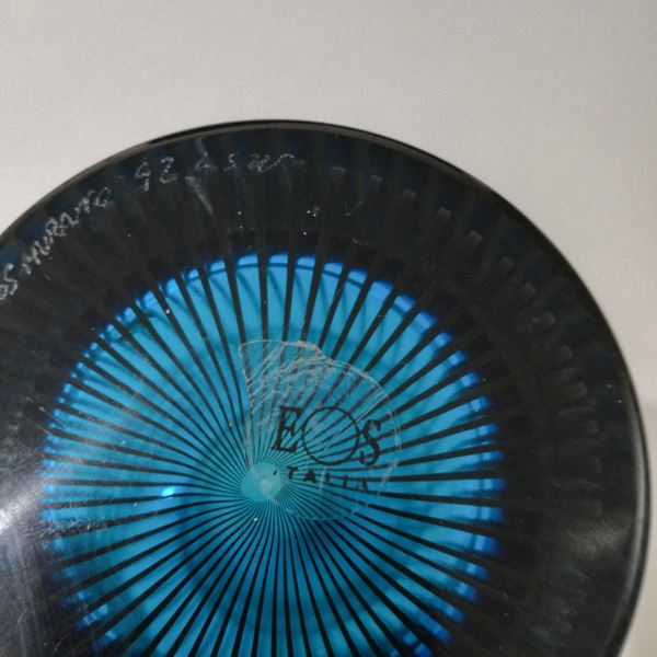 Vetro soffiato azzurro rigato di nero con una sciarpa di canne in cristallo raccolte e formate a caldo.