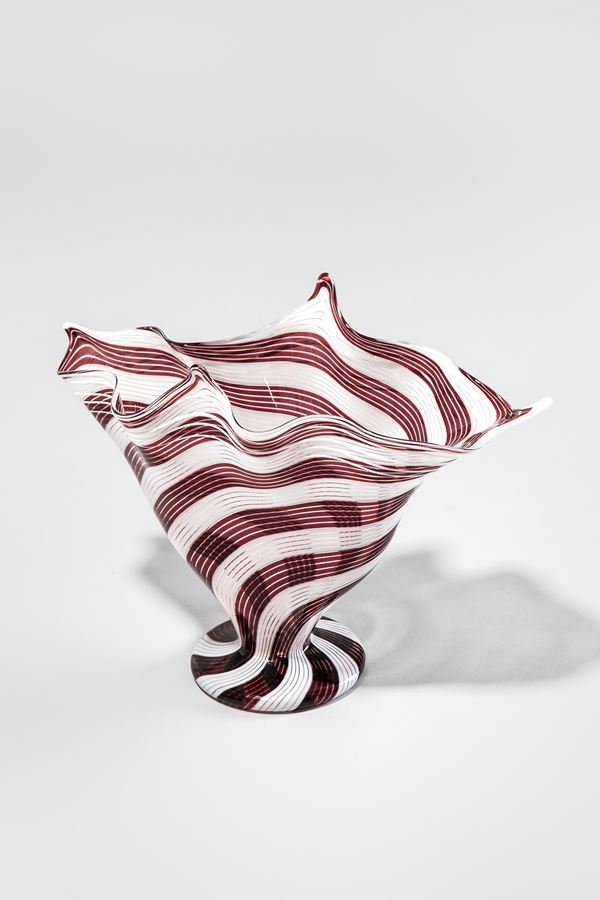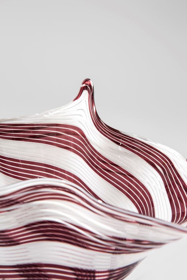 Vetro soffiato decorato a canne bianche e bordeaux disposte a spirale.