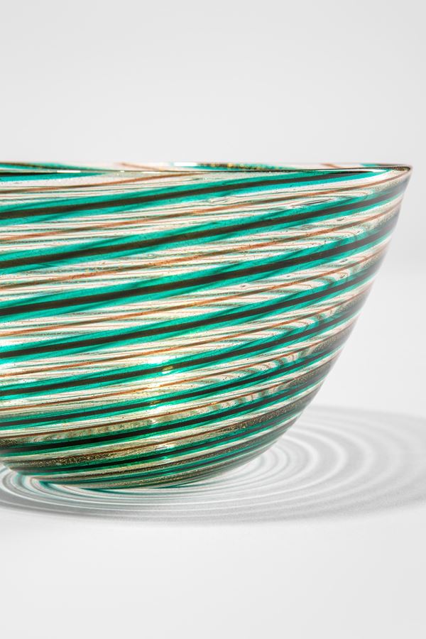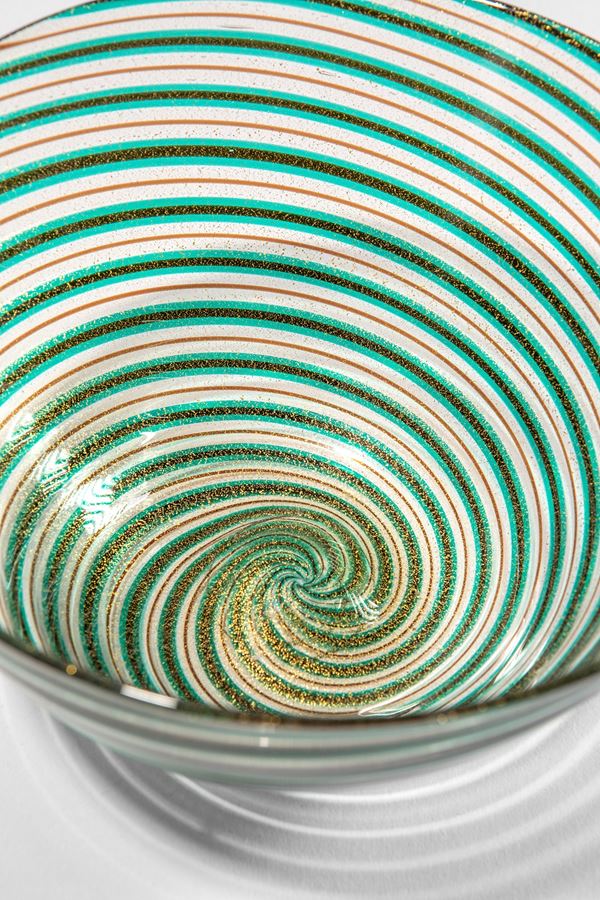 Vetro soffiato cristallo con canne verdi, nere e avventurina disposte a spirale.