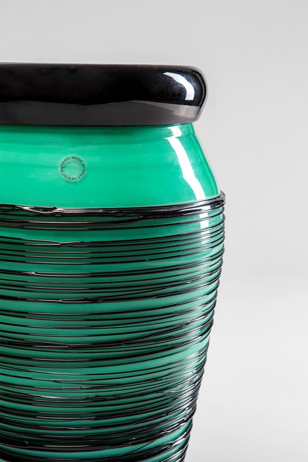 Vetro soffiato nero incamiciato in verde a fili neri irregolarmente avvolti a spirale.