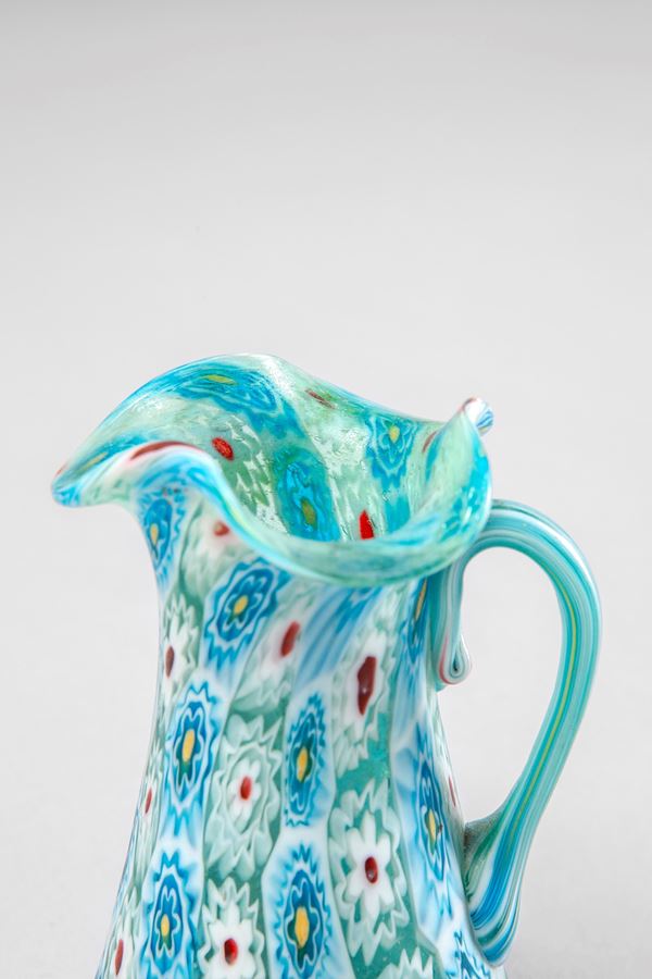 Vetro soffiato a murrine policrome con ansa applicata a caldo.
