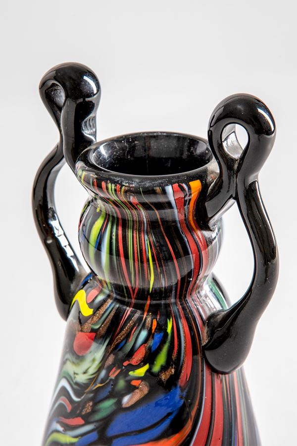 Vetro soffiato in pasta vitrea nera lavorato a macchie policrome e avventurina, con due anse applicate a caldo.