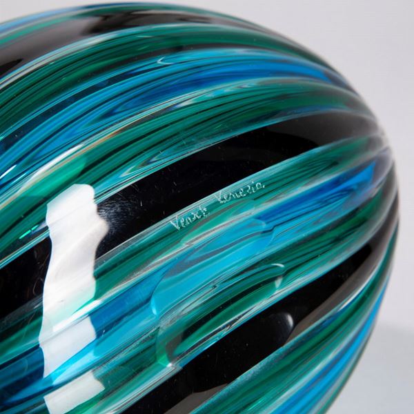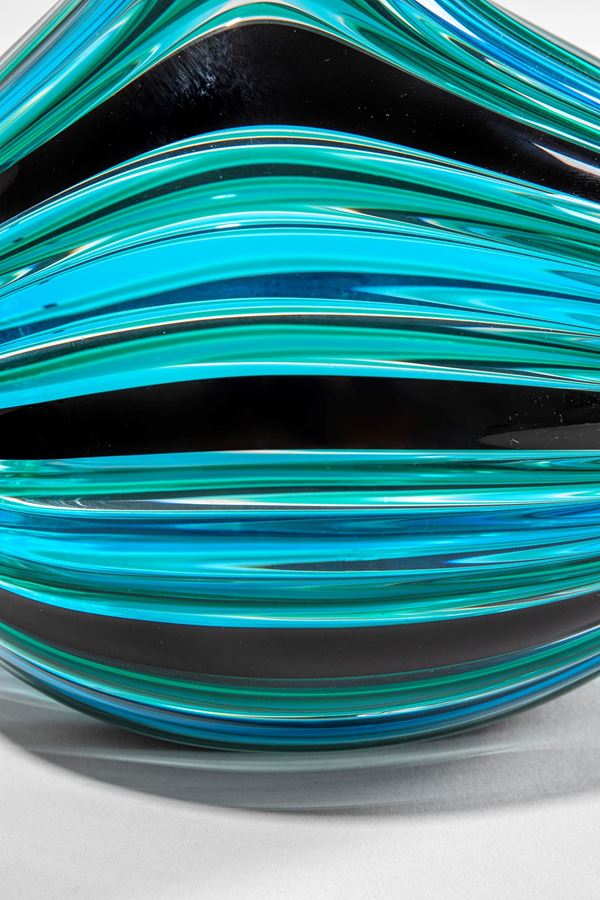 Vetro soffiato con fasce cristallo, verde, nero e turchese disposte in orizzontale su tutta la superficie.