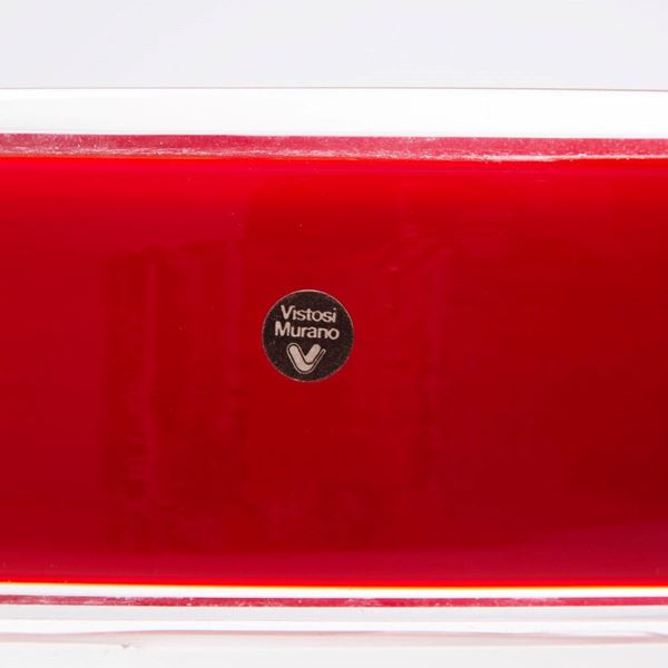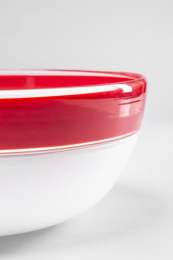 Vetro soffiato lattimo, con fascia rossa a incalmo.
