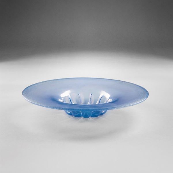 Vetro soffiato trasparente azzurro con fondo baccellato, superficie leggermente iridata.