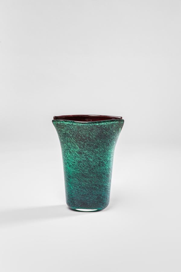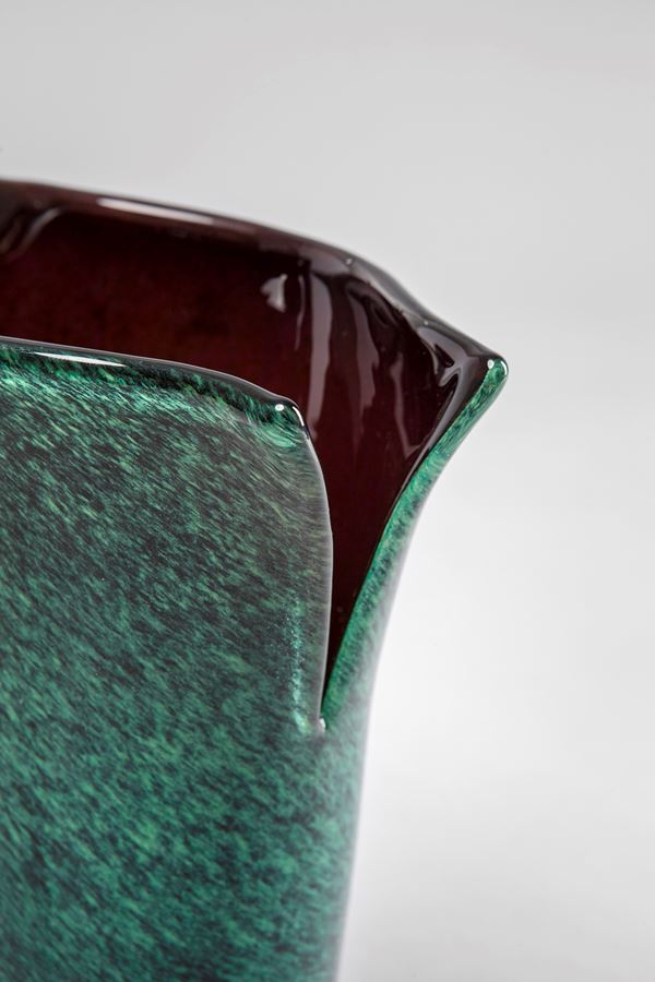 Vetro soffiato incamiciato verde e nero con tagli all’estremità dell’apertura.