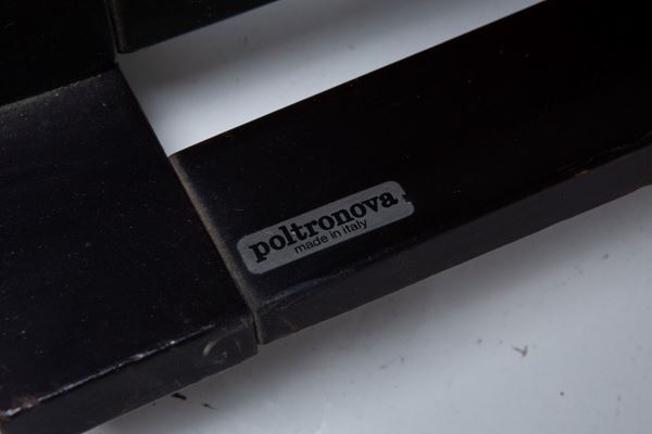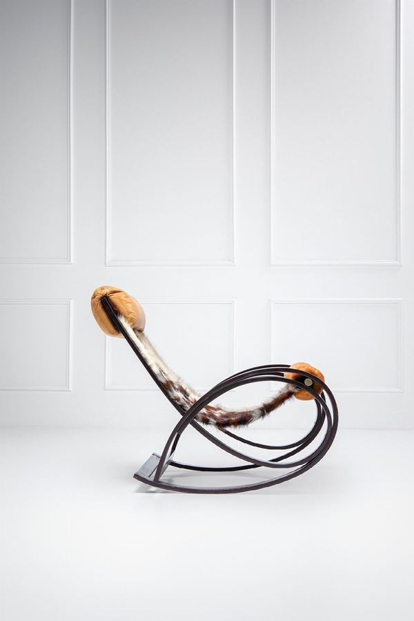 Legno curvato tinto, pelle e tessuto sintetico a imitazione della pelliccia.