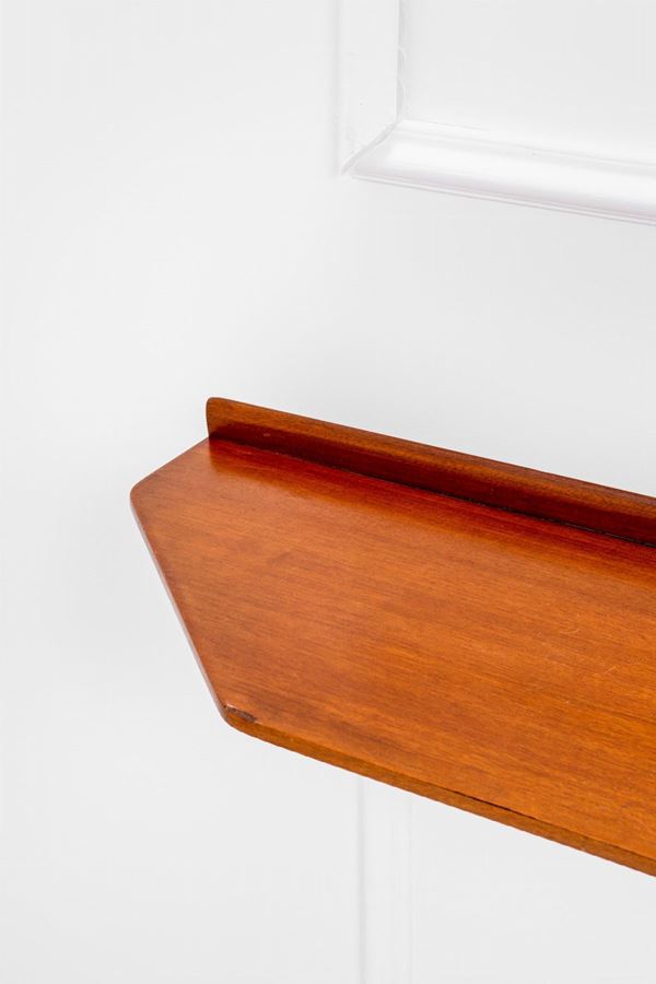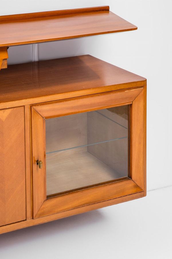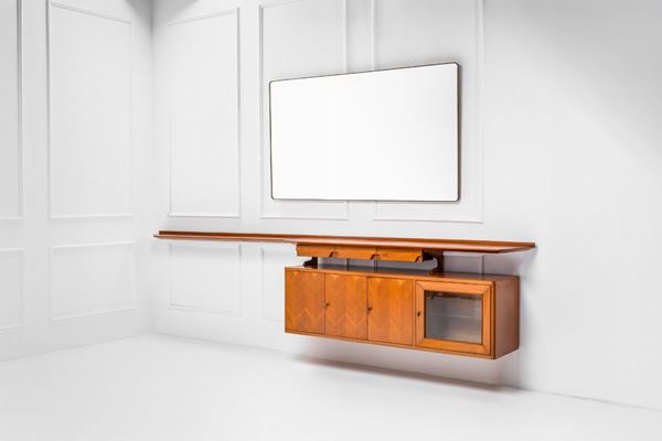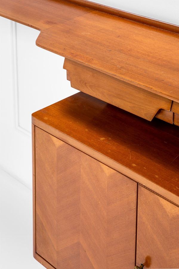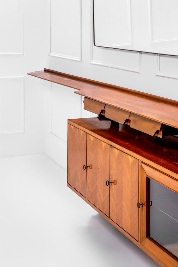 Legno sagomato impiallacciato, legno massello, cristallo, vetro specchiato, ottone.