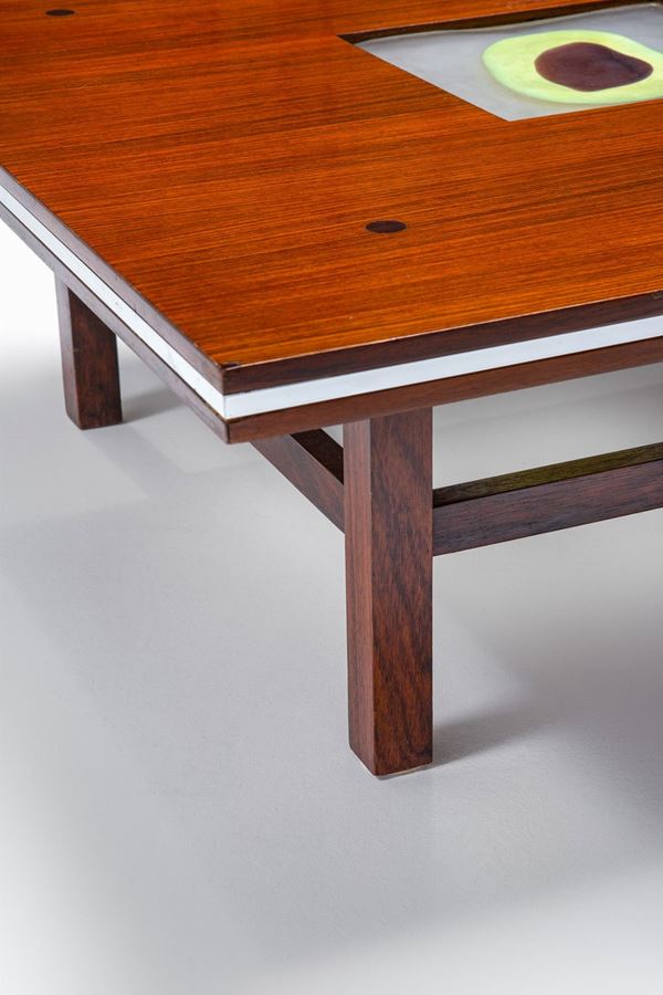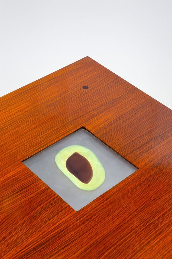 Legno impiallacciato, legno massello, metallo laccato, piastrella in vetro con grande murrina di venini.