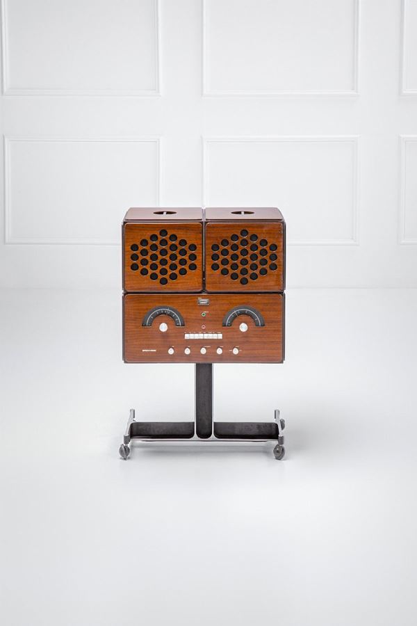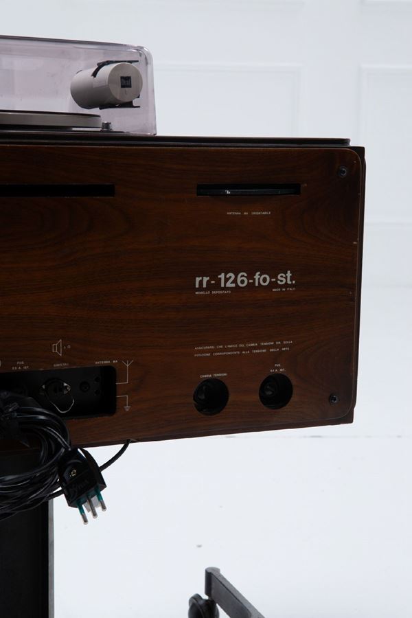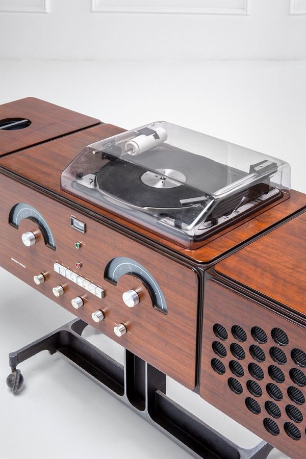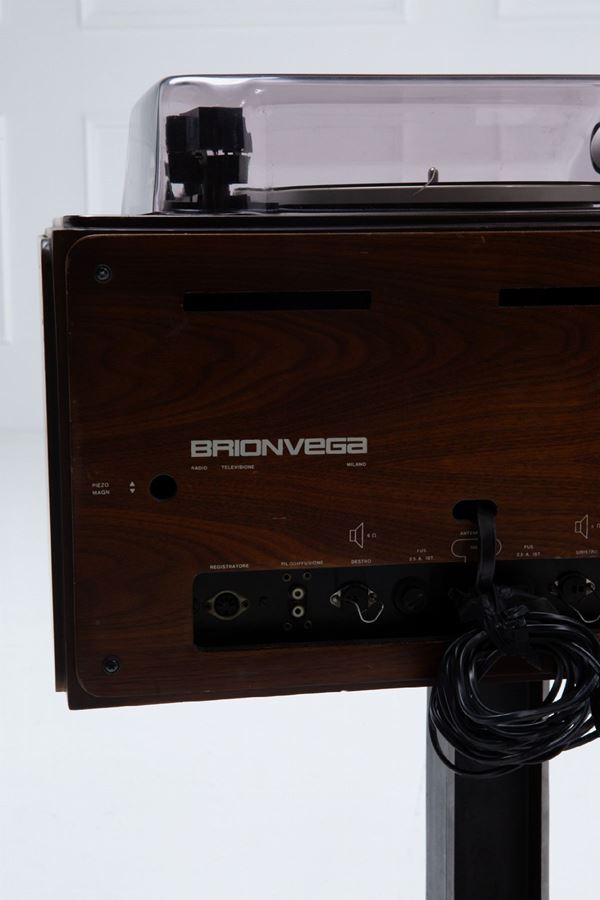 Mobile in compensato impiallacciato in legno di noce, coperchio del giradischi in plexiglass trasparente, base in fusione di alluminio.