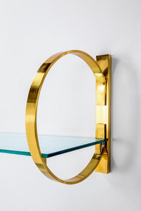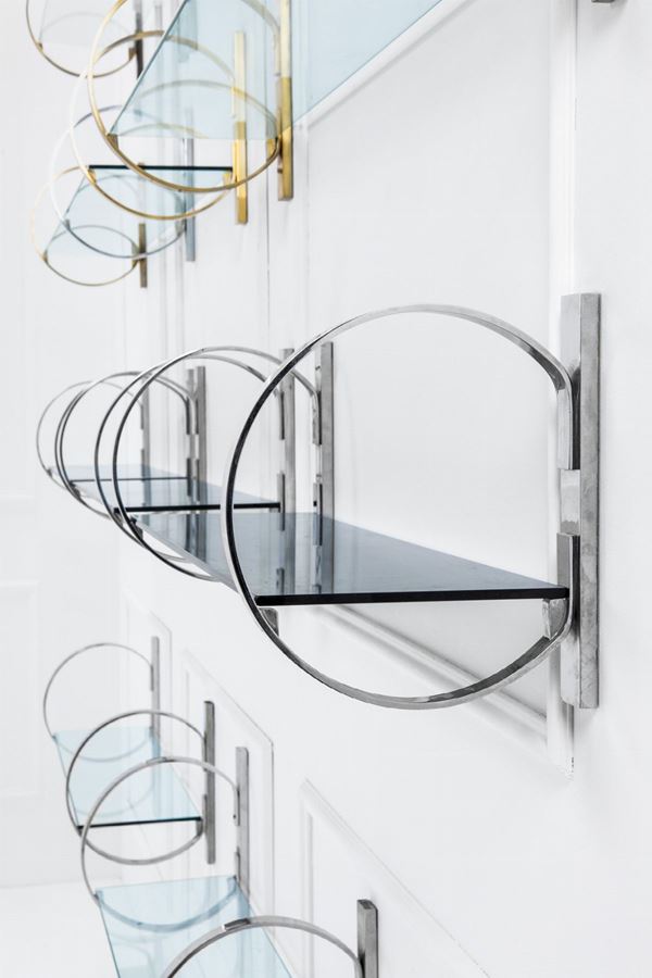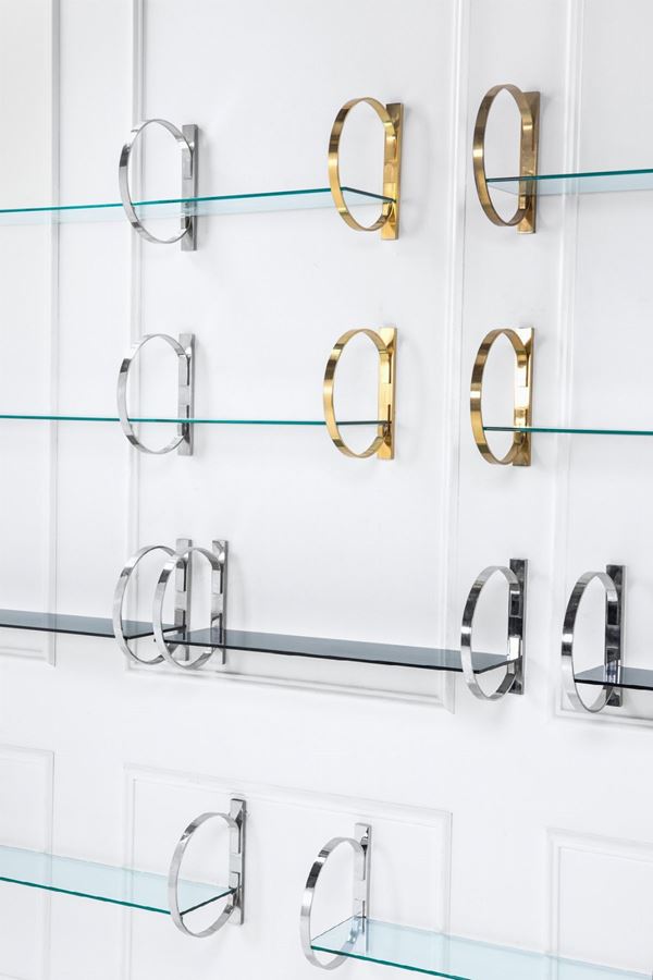Cristallo trasparente, cristallo fumé, ottone lucido, metallo cromato.