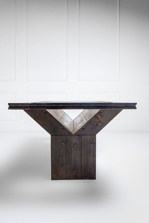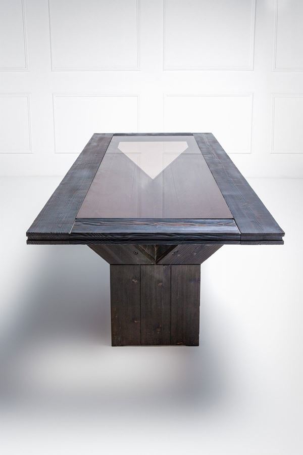Legno massello trattato con fiamma ossidrica e verniciatura trasparente, cristallo.