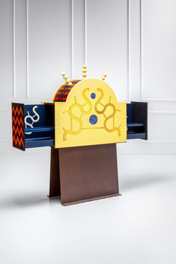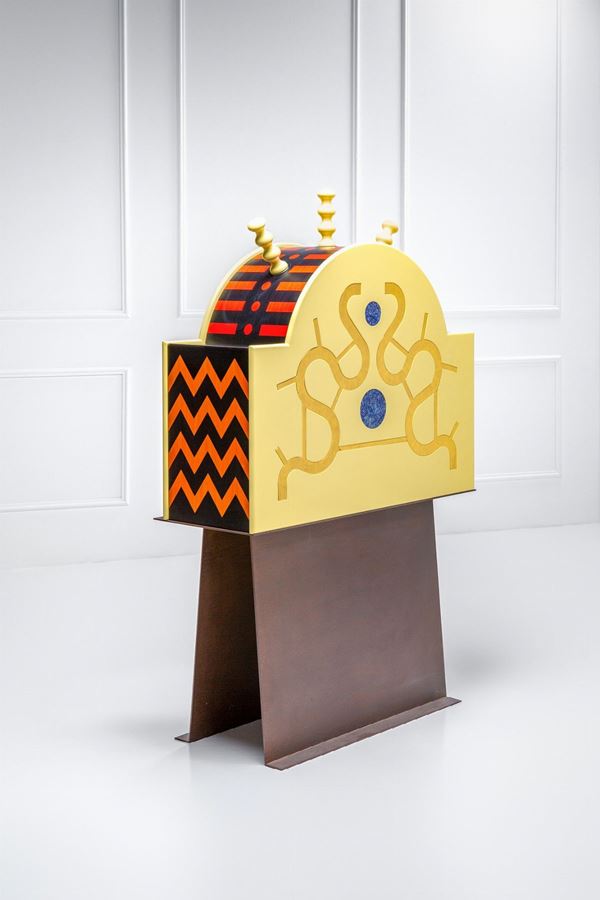 Acciao ossidato, legno laccato e intarsiato, foglia d'oro.