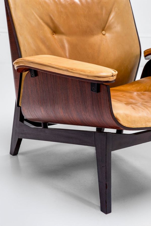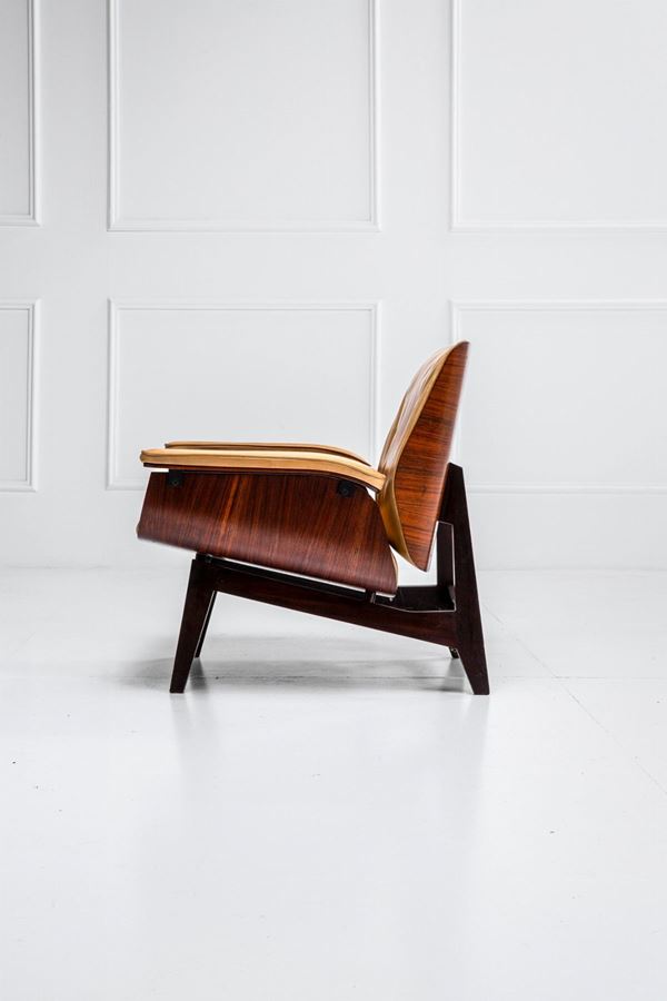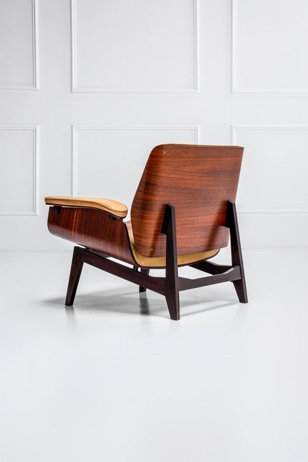 Legno multistrato curvato impiallacciato, legno massello, pelle.