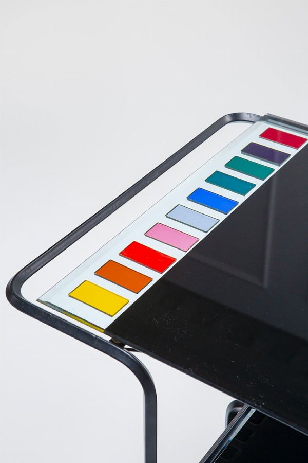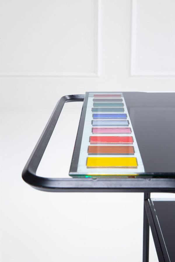 Acciaio verniciato a fuoco, cristallo temperato, tessere di vetro colorato.