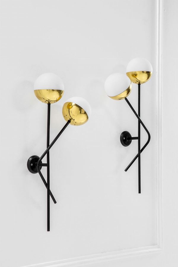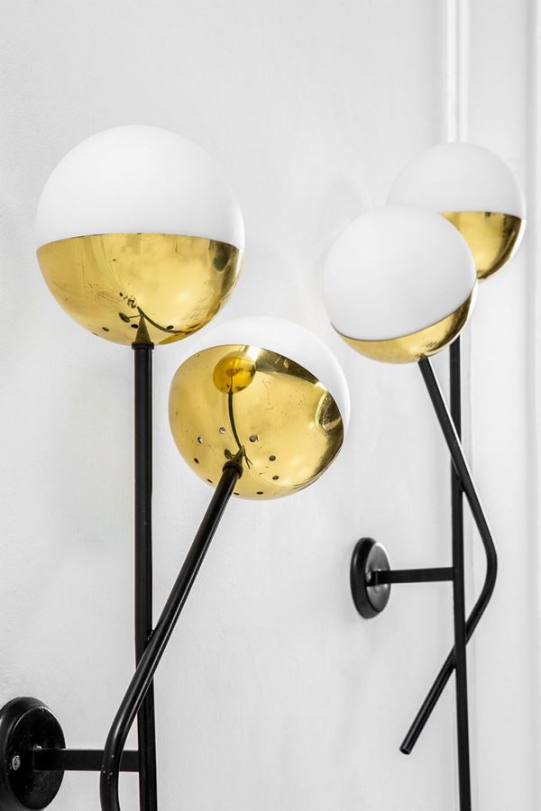 Ottone lucido, metallo verniciato, vetro opalino satinato.
