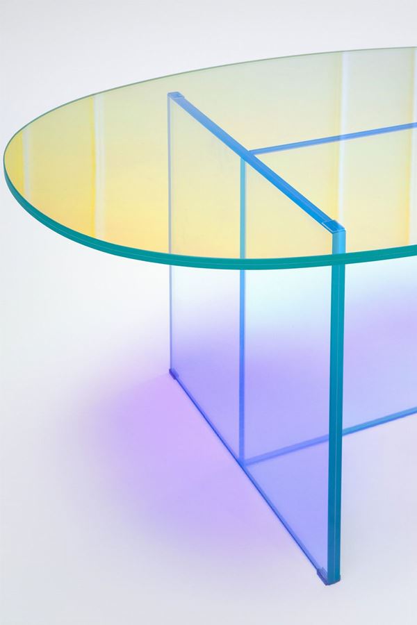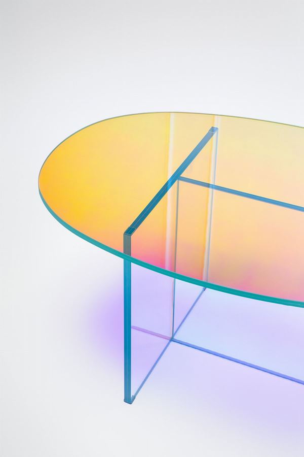 Cristallo stratificato e incollato con una speciale finitura multicromatica cangiante.