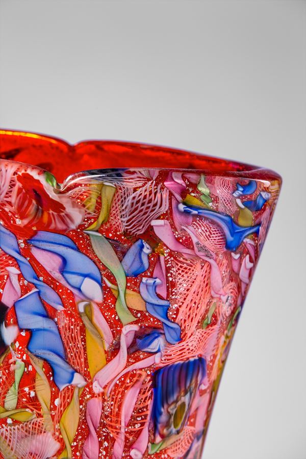 Vetro soffiato rosso con foglia d’argento, sommersione di murrine e frammenti di canne policrome.