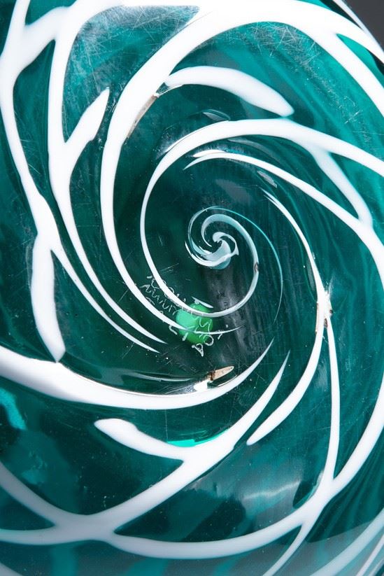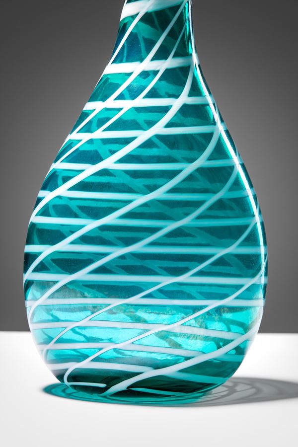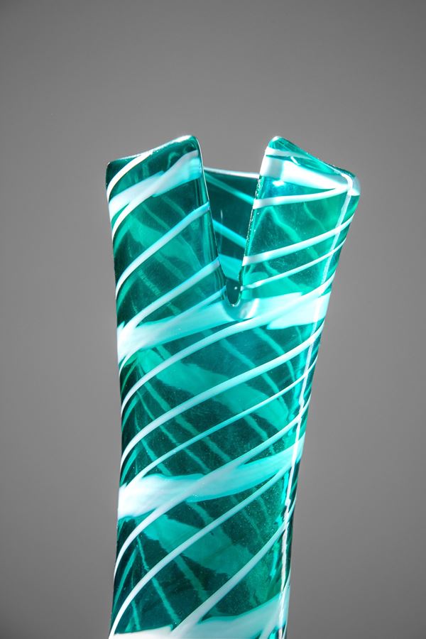 Vetro soffiato trasparente verdognolo decorato da una trama a rete di fili lattimo e rifinito da forte iridazione.