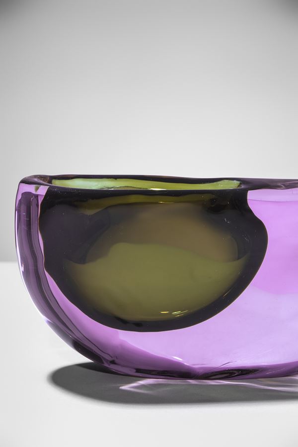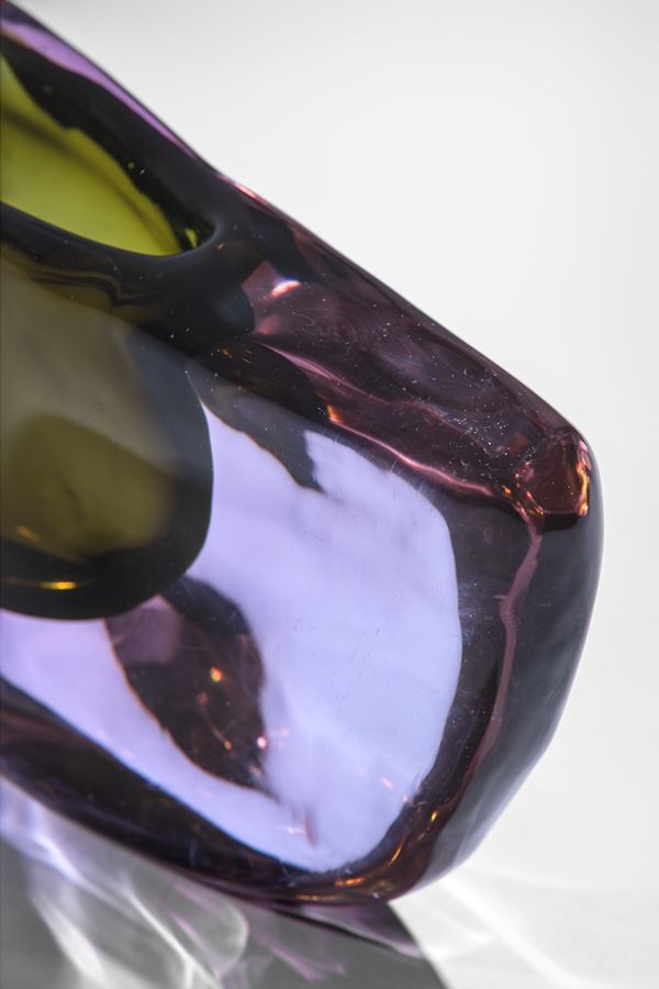 Vetro soffiato violetto con sommersione in vetro verde scuro.
