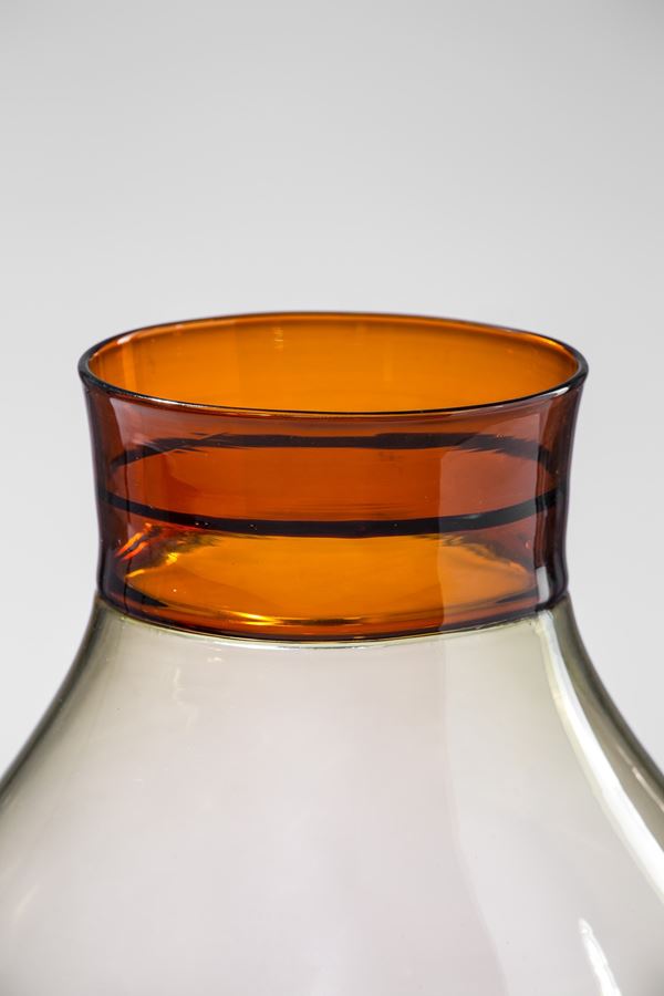 Vetro soffiato ambra con collo incalmato di differente colore.