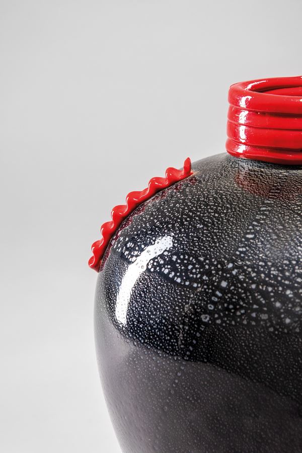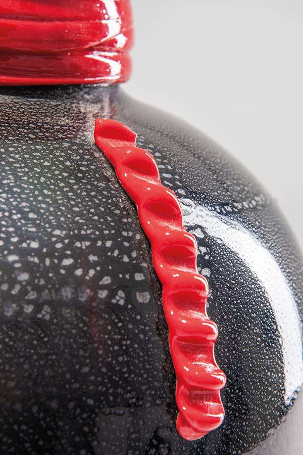 Vetro soffiato nero con inclusione di foglia d’argento, bocca e piede costituiti da un filamento in pasta vitrea rossa, prese laterali a morise.
