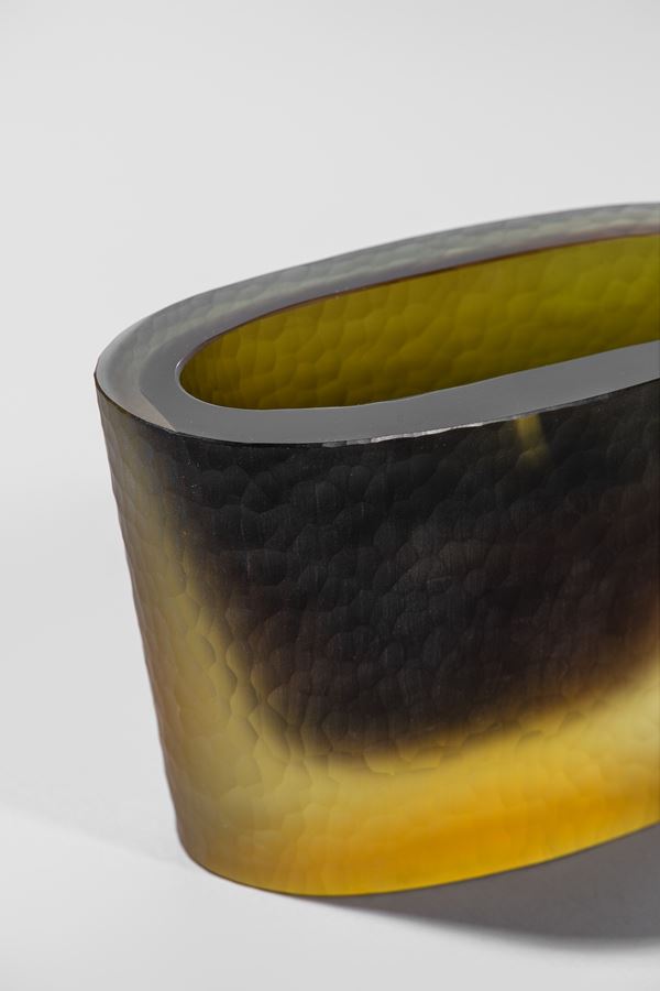 Vetro soffiato sommerso verde e giallo; superficie battuta alla mola.