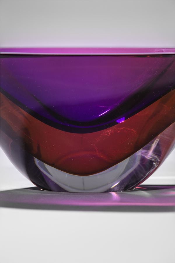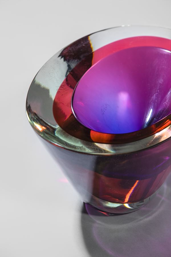 Vetro soffiato sommerso cristallo, violetto e rosso rame.